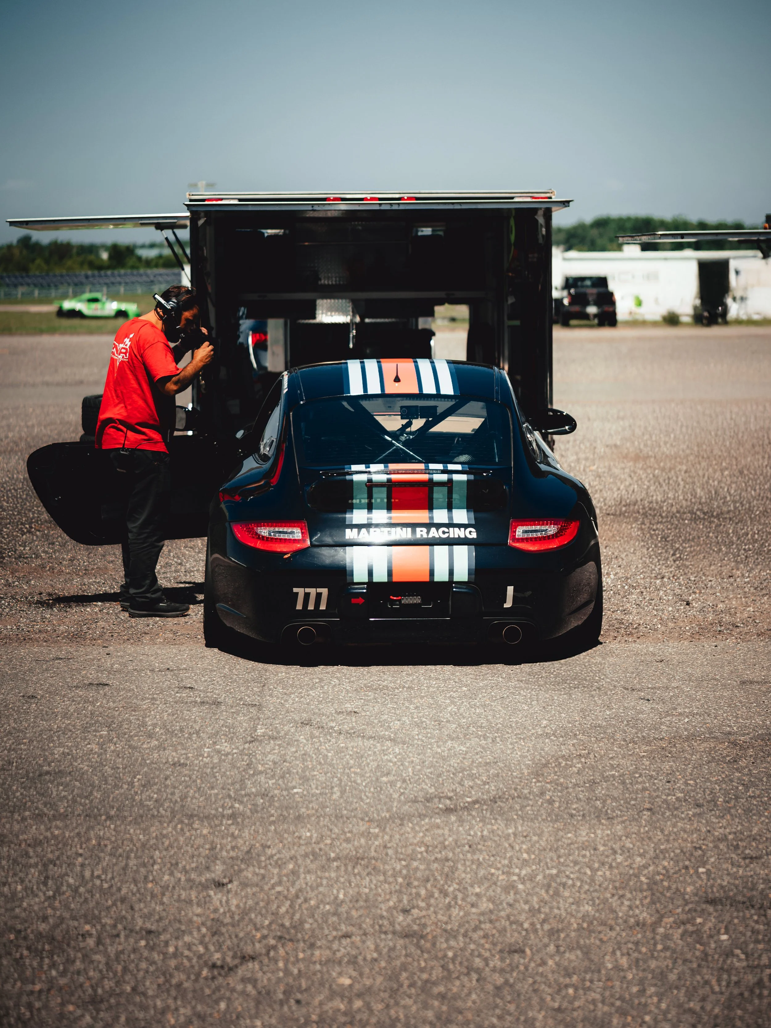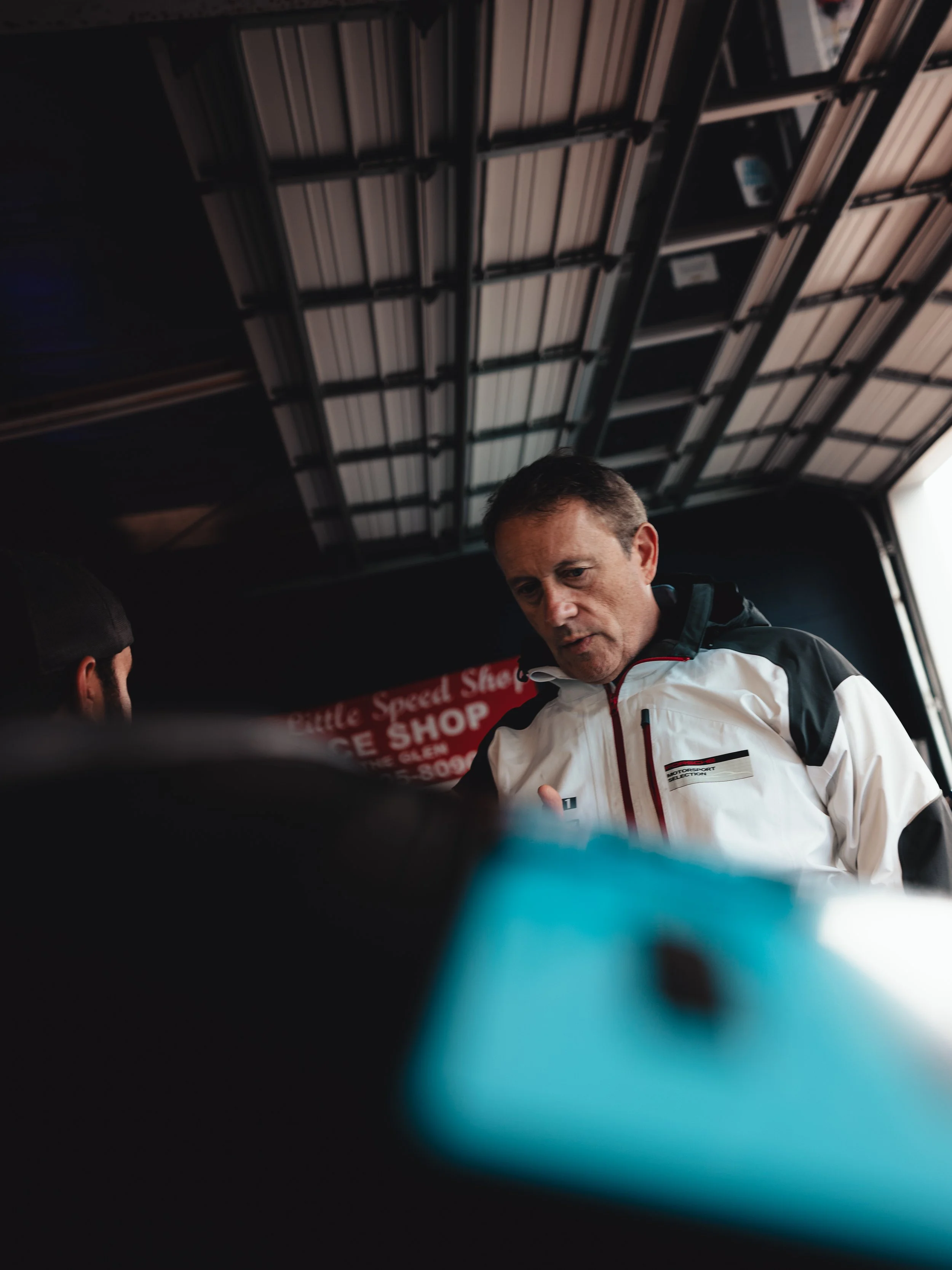 At a folding table, helmet cooling fan humming softly, laptop glowing blue on his face, he looked more like a watchmaker than a driver about to go 150 mph. Calm, deliberate, composed. He sipped coffee—his one admitted vice—and clicked through data and video while the storm spun around him.