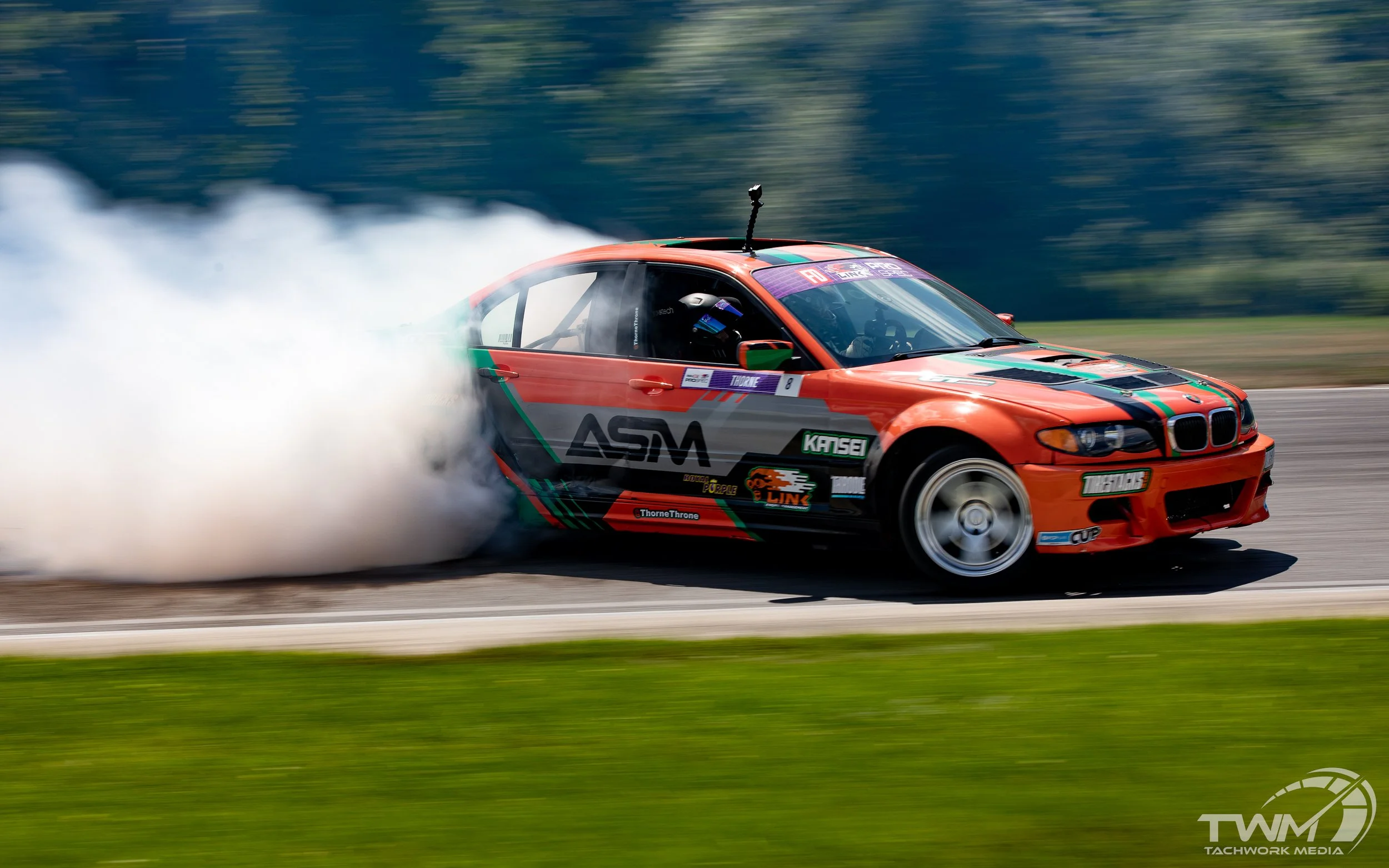 Cars worked in a stream, leaving room between slides until everyone got comfortable closing the gaps, when pairs would start forming between teams for tandem drifting. The legendary photographer Larry Chen played chase for each session in his borrowed Supra with a whole bunch of Canon cameras and GoPros suctioned to the hood, keeping up with even the most powerful cars as they ripped up the track, absolutely sending it into turn 1 at 90mph and linking smoky corners for the first time in Lime Rock's history.