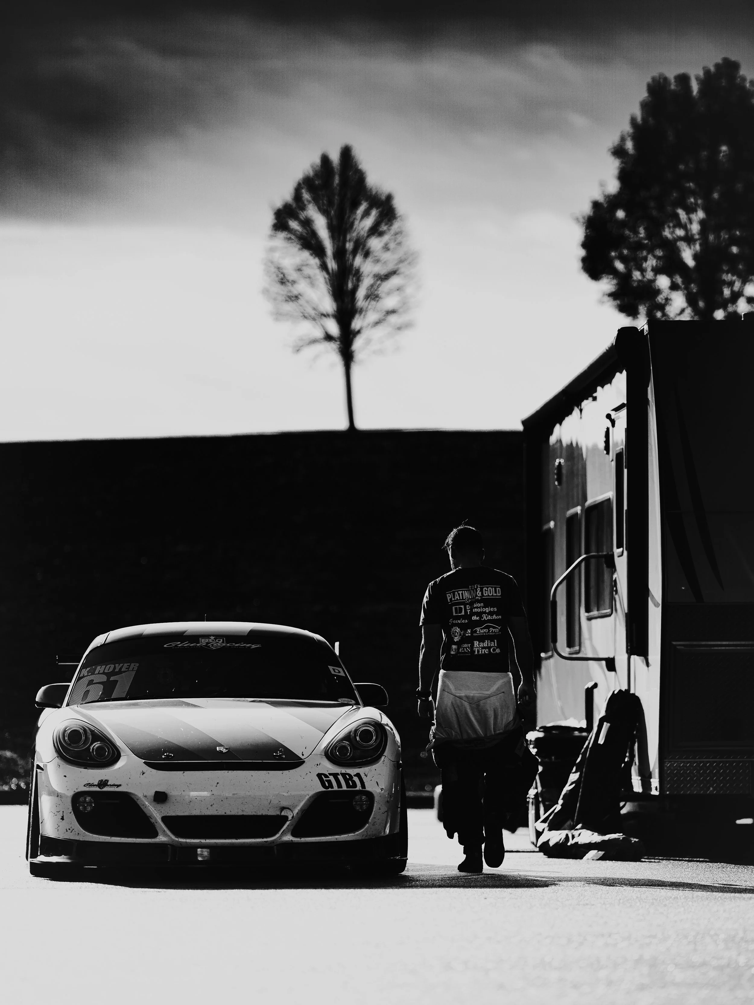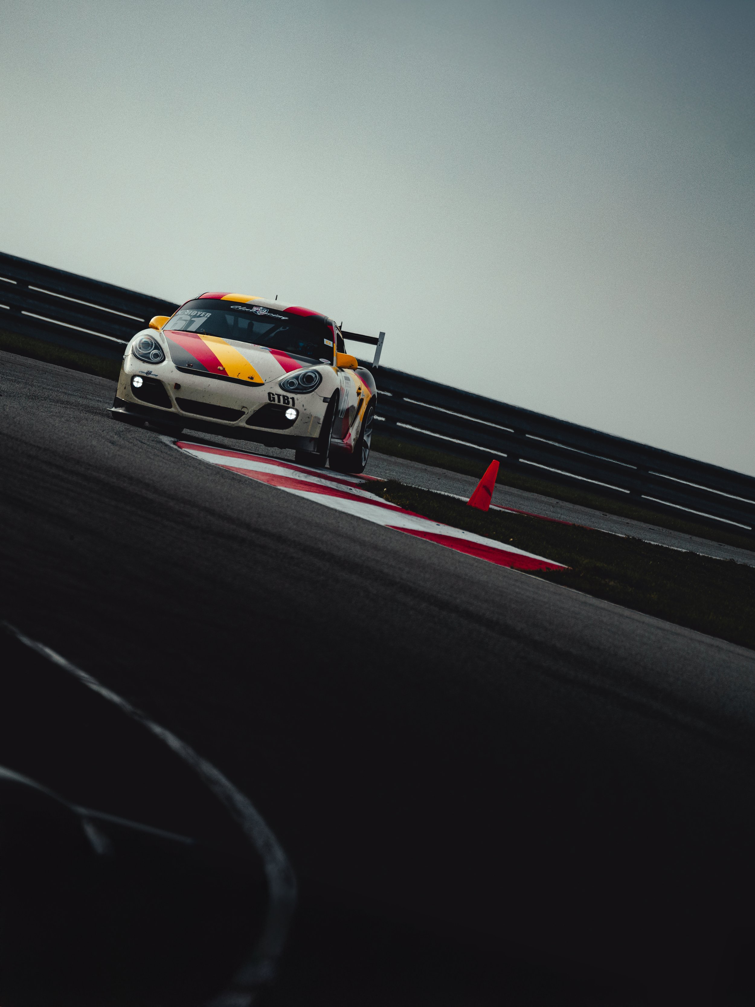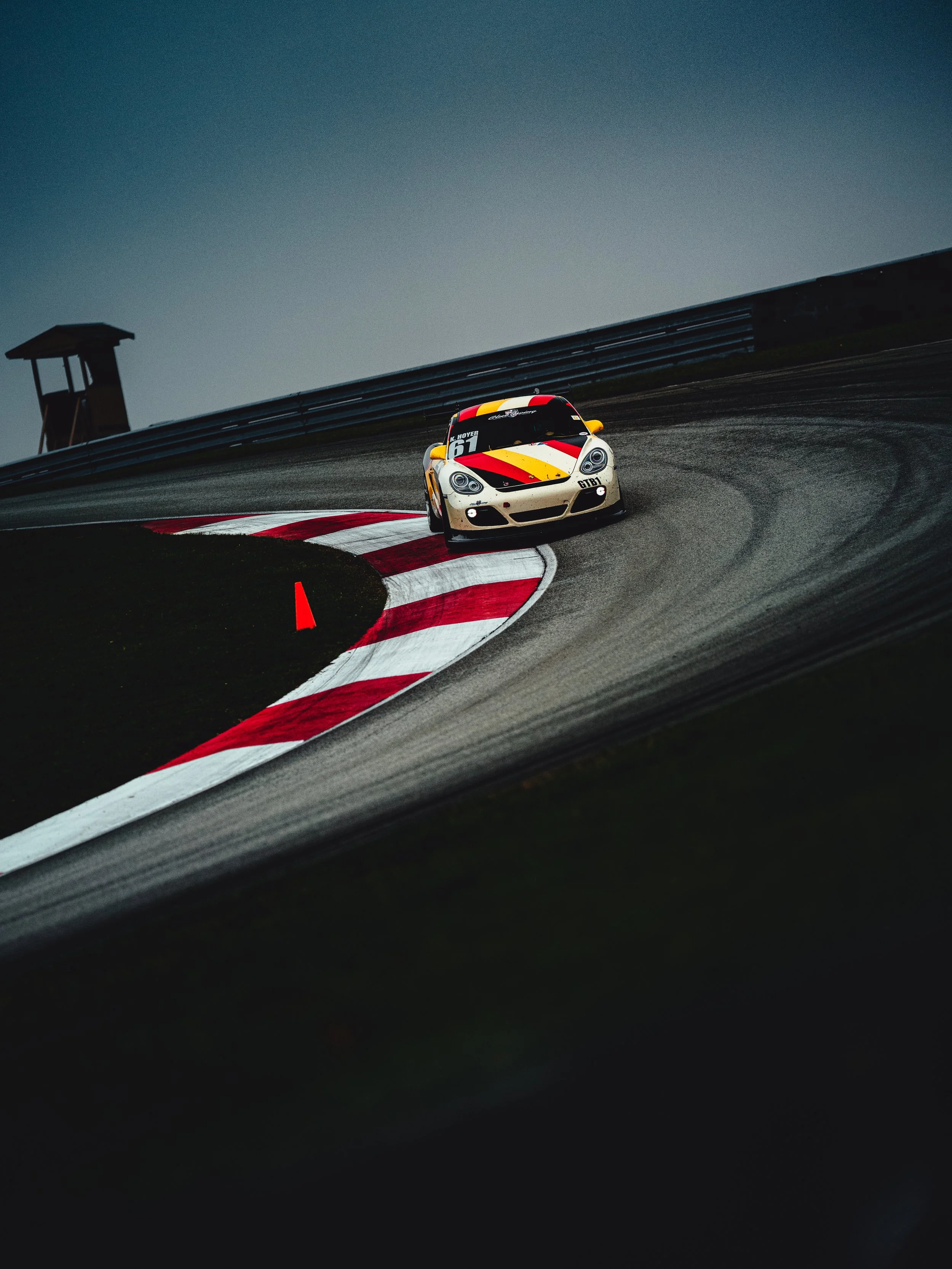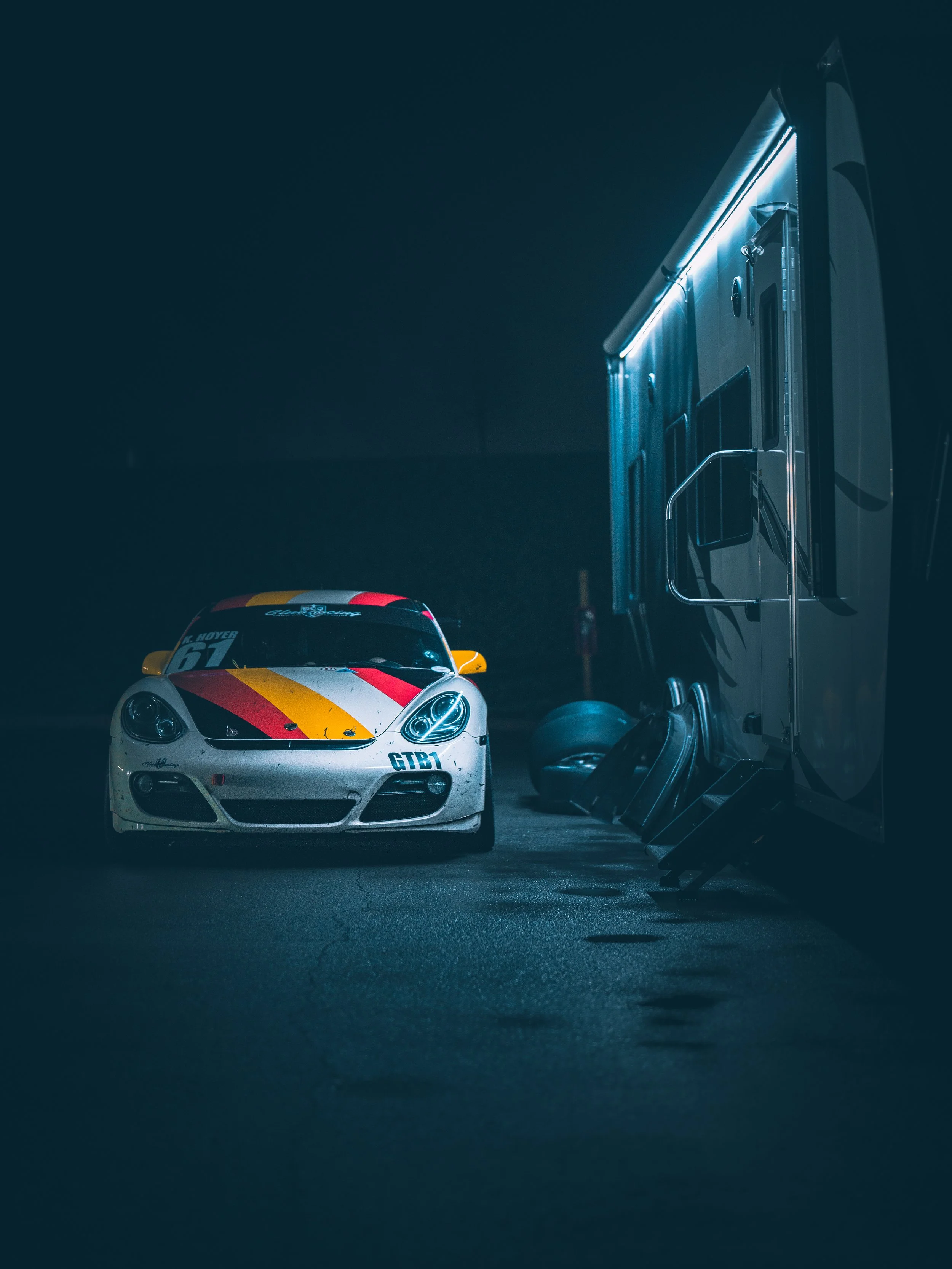 We arrived the night before. Kyle’s Cayman GTB1 sat silent beside the RV, stripes cutting through the dark—cream broken by yellow, red, black. The pavement was soaked, reflective, restless. Two days of rain had already rewritten the surface.
