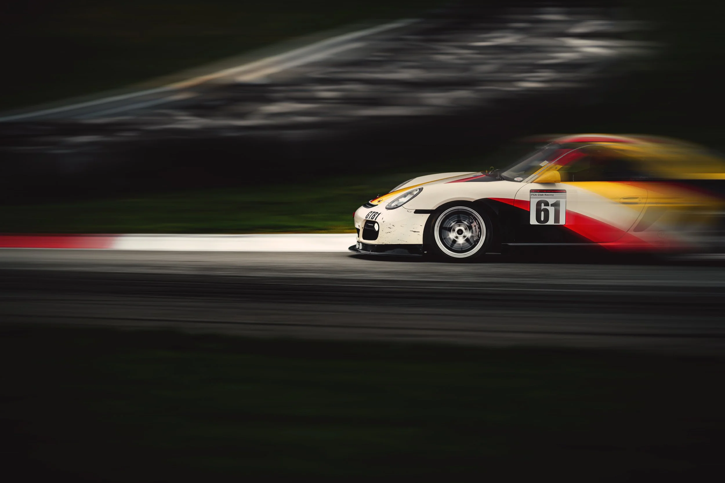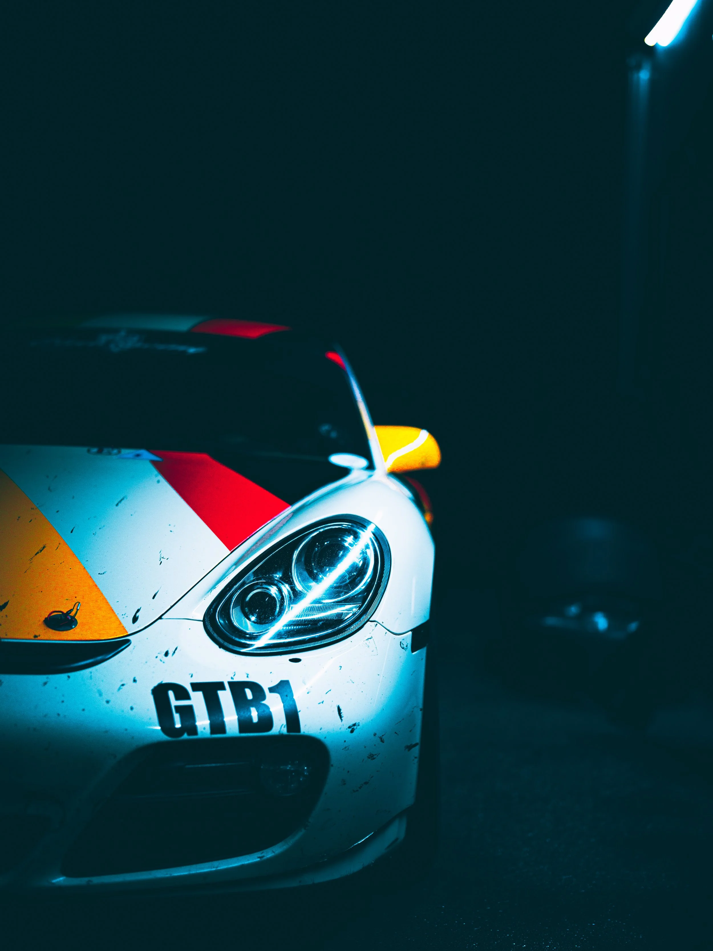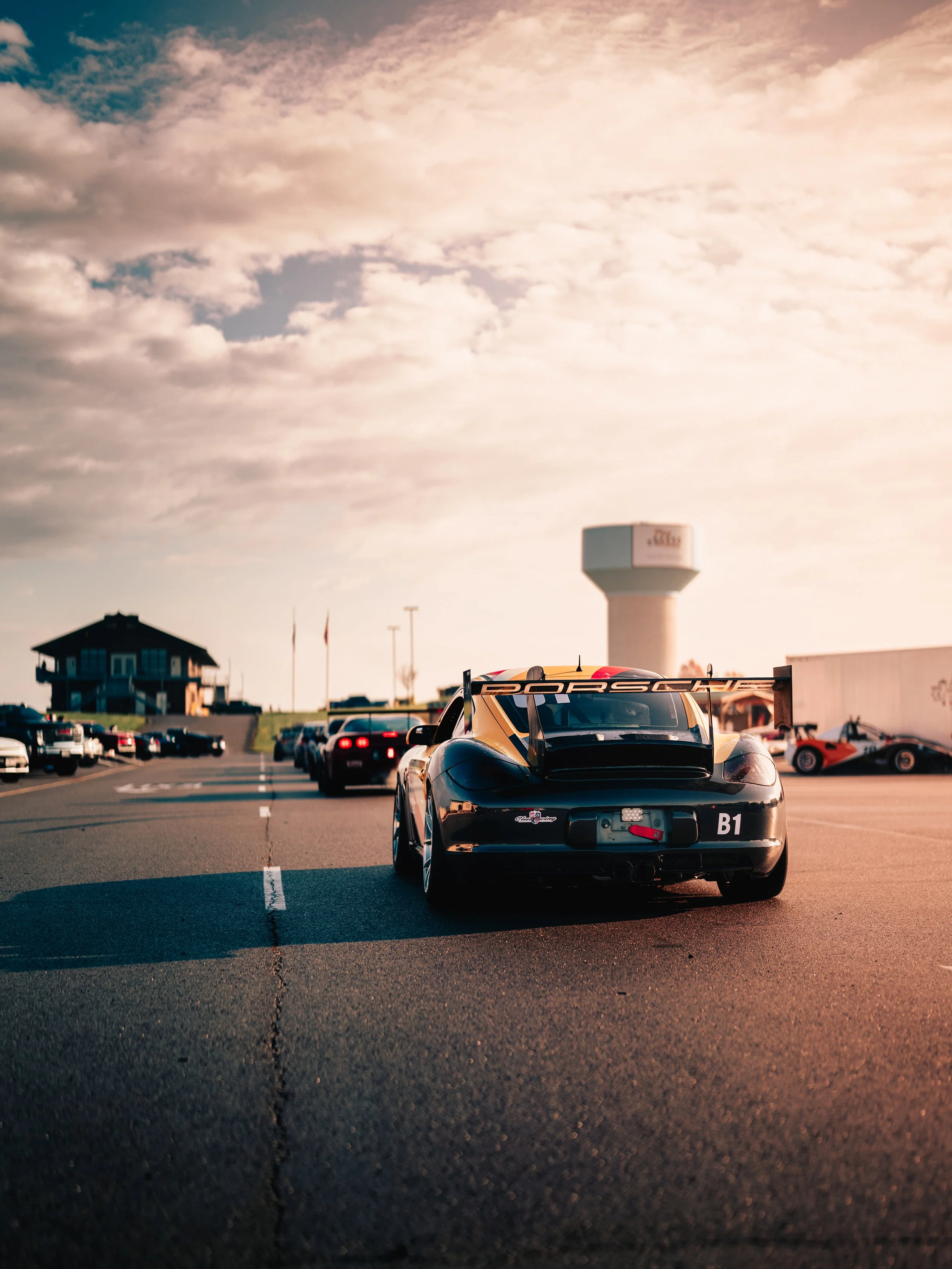 We arrived the night before. Kyle’s Cayman GTB1 sat silent beside the RV, stripes cutting through the dark—cream broken by yellow, red, black. The pavement was soaked, reflective, restless. Two days of rain had already rewritten the surface.