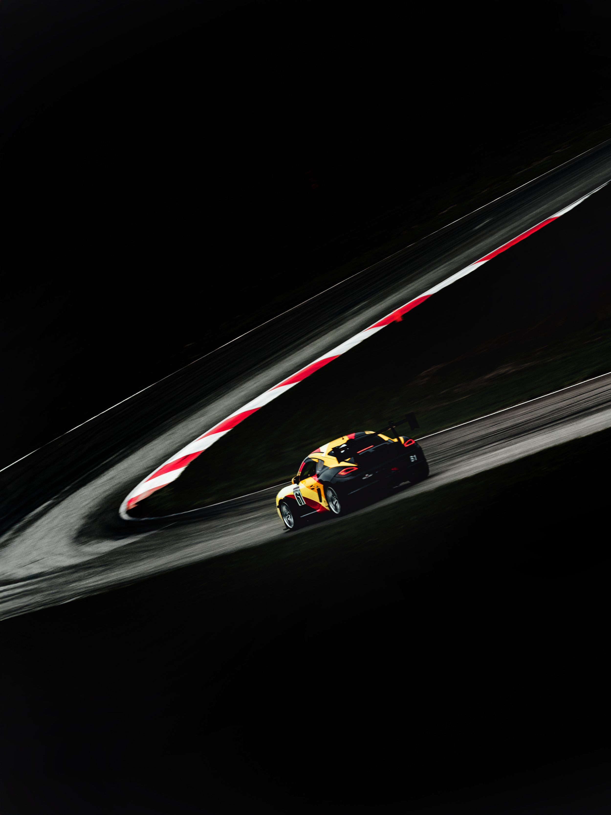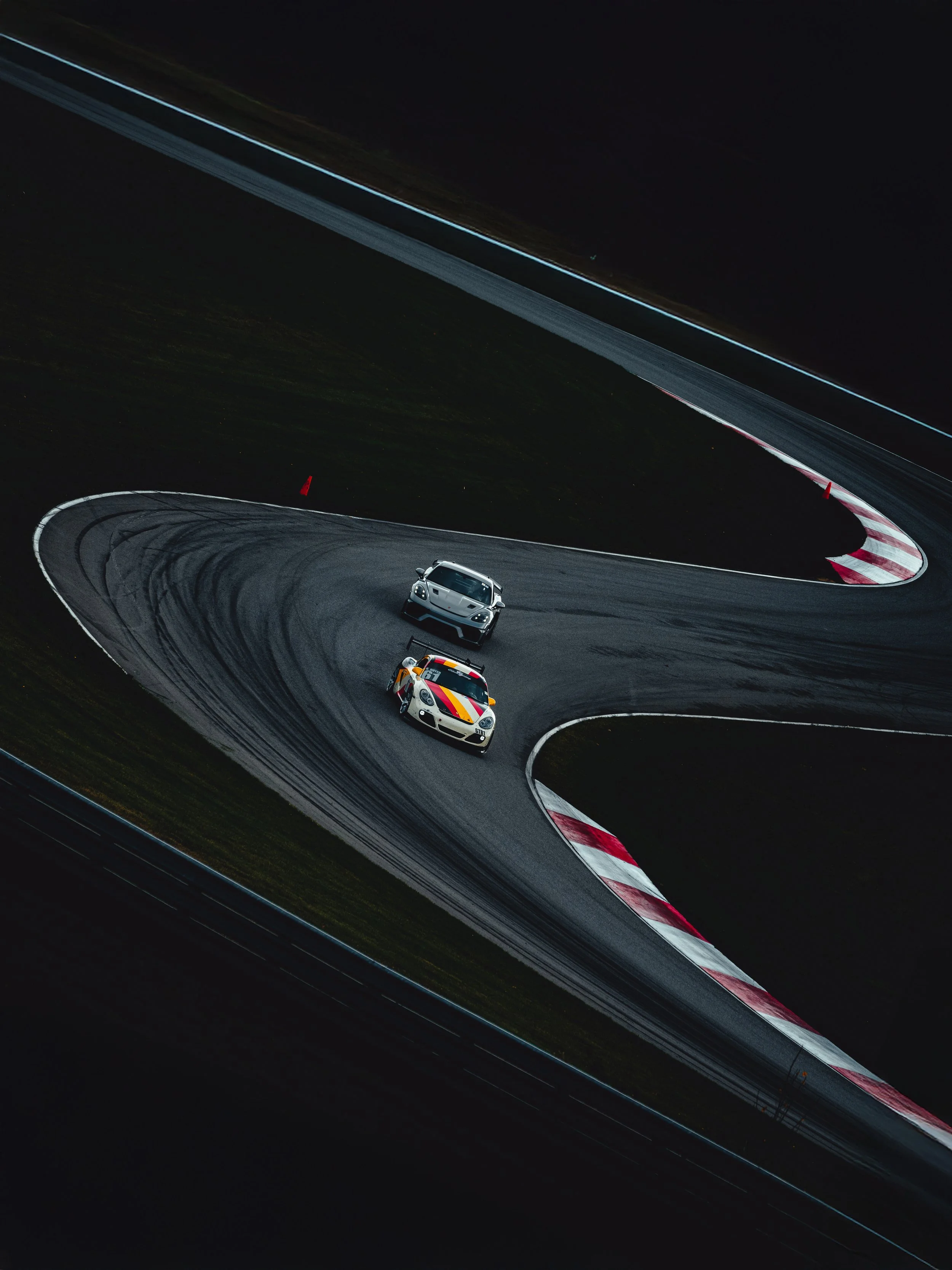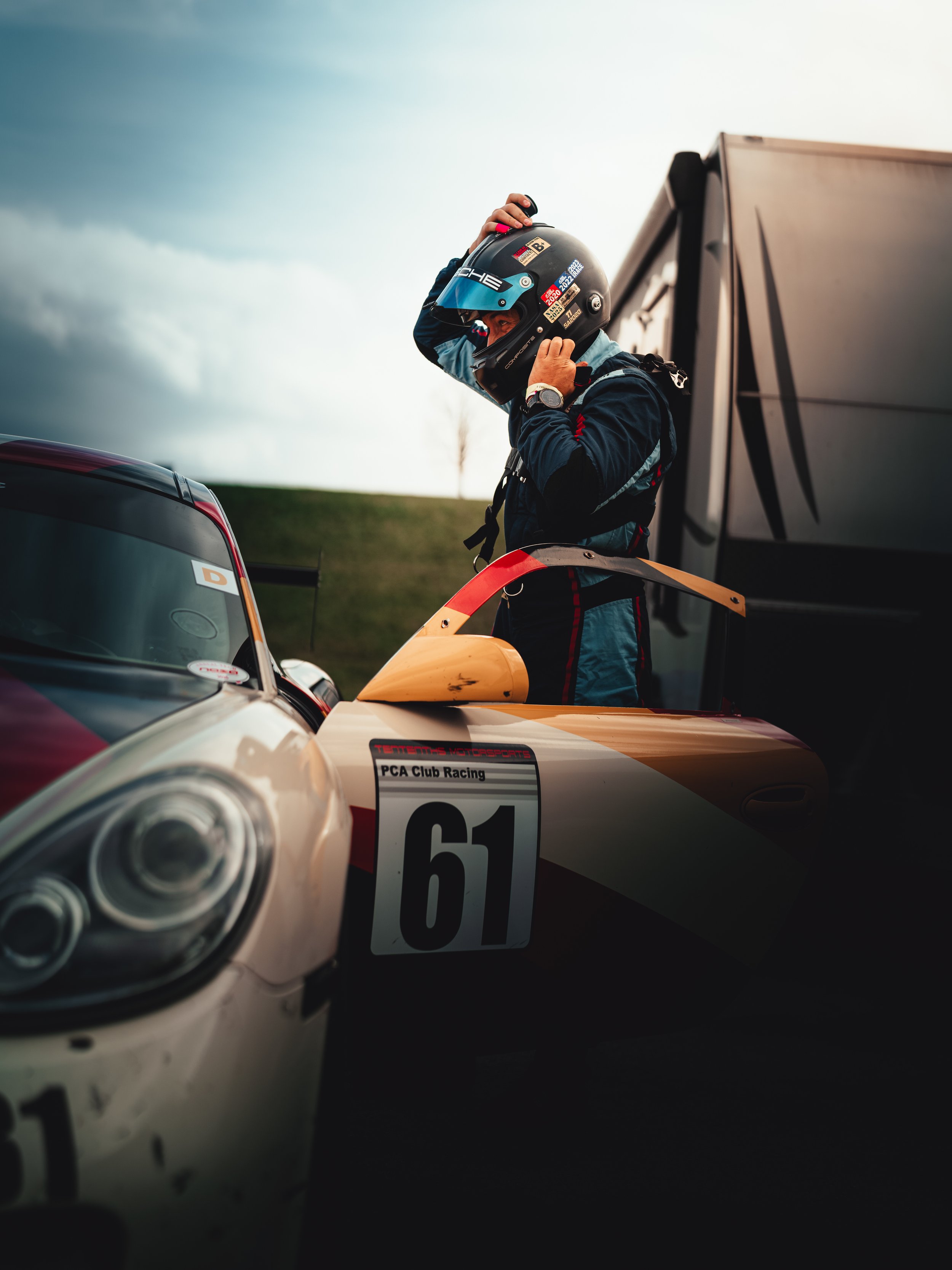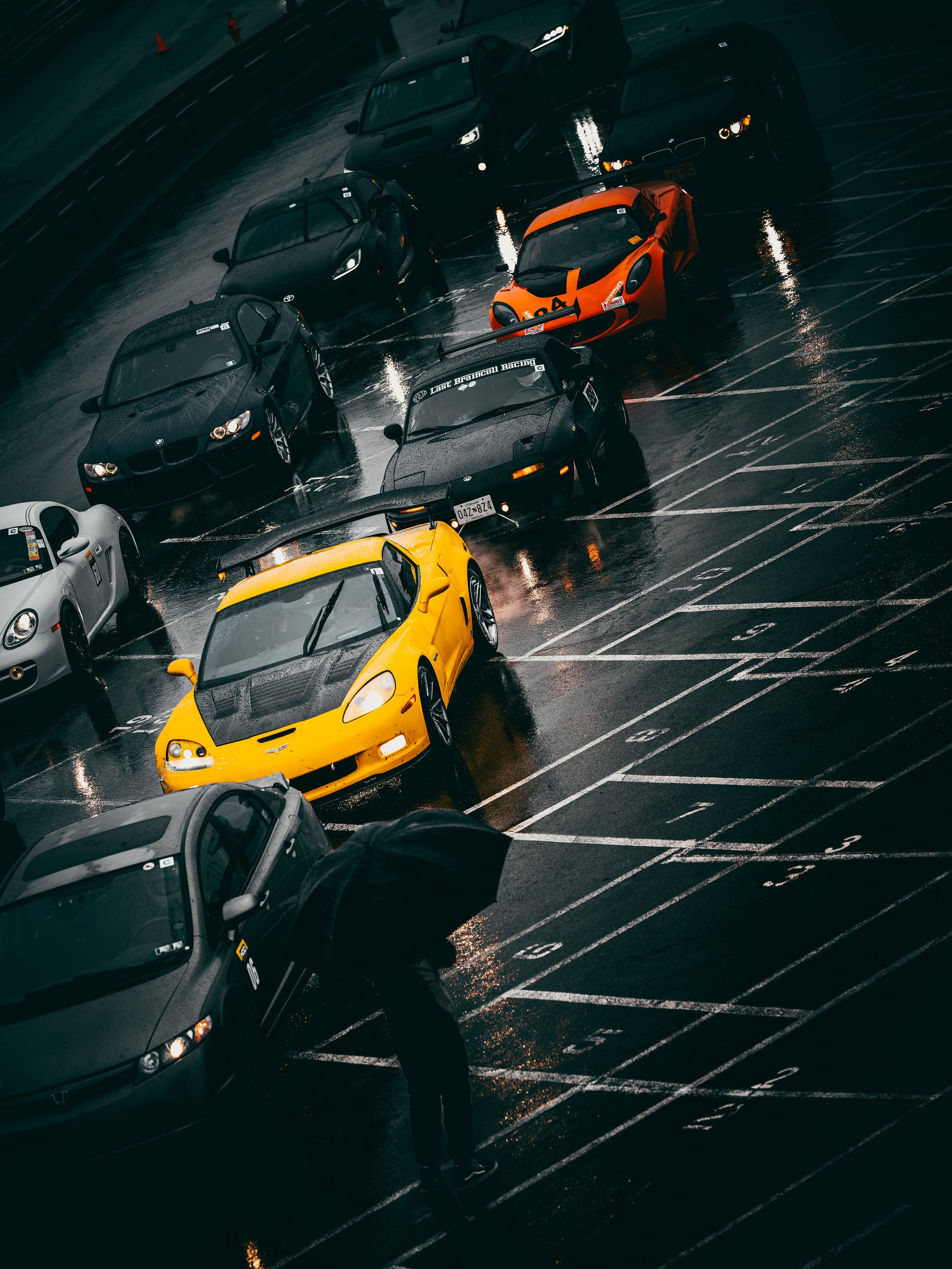 We arrived the night before. Kyle’s Cayman GTB1 sat silent beside the RV, stripes cutting through the dark—cream broken by yellow, red, black. The pavement was soaked, reflective, restless. Two days of rain had already rewritten the surface.