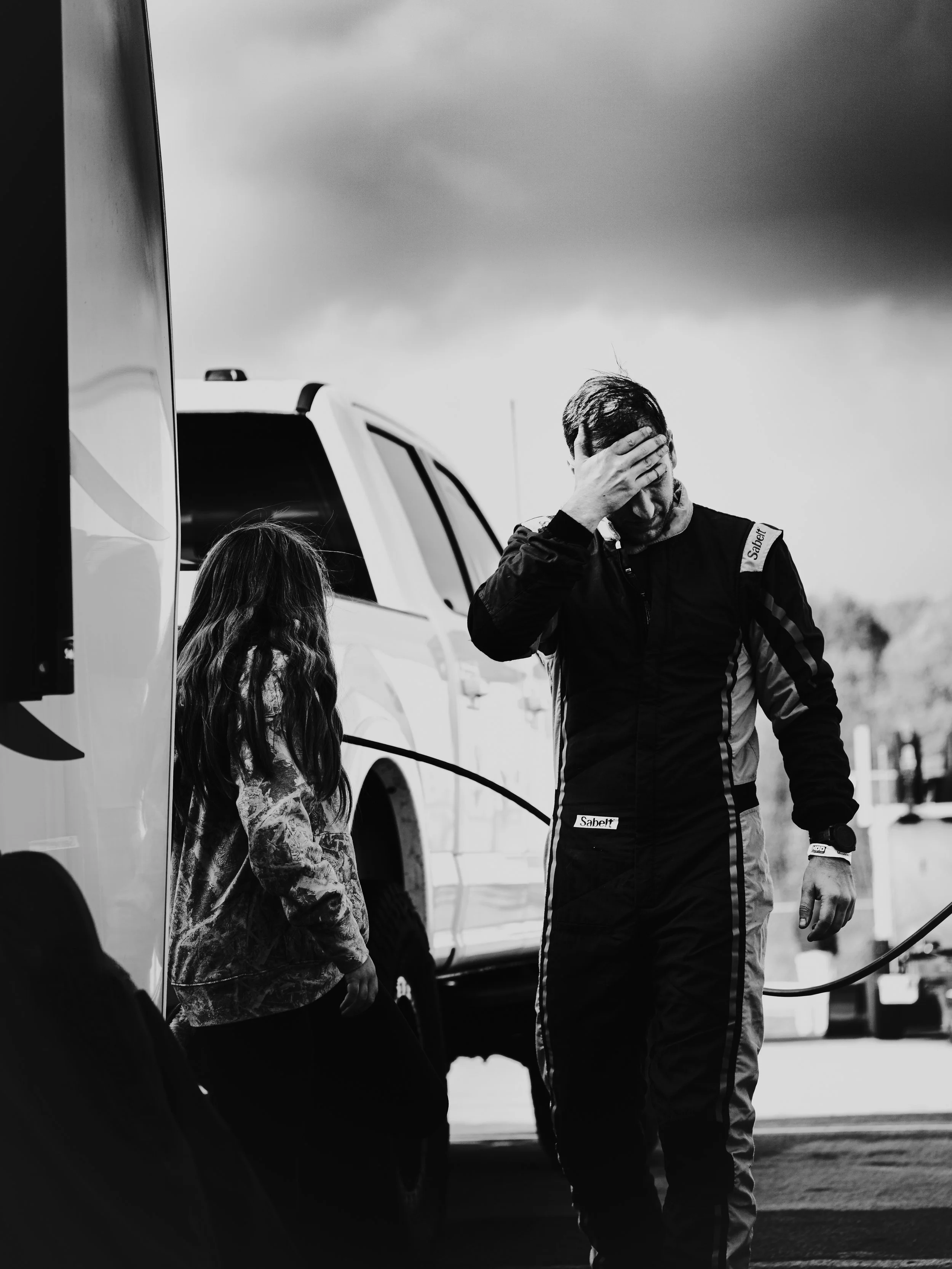 A strange mechanical rumbling chatter noted by Kyle after one run stopped everything. The rhythm out there was wrong. Surface too loose. Too slow. A clutch press brought a sigh of relief - it wasn’t engine, it was a tired throw-out bearing. Weather rolled in again. Silence. Relief arrived quietly, cars queued up in grid again. Fog lifting just enough to see the next corner.